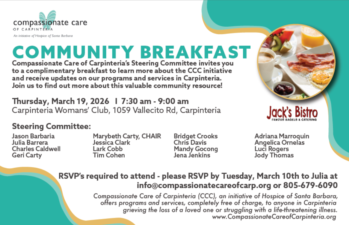 Compassionate Care of Carpinteria (CCC), an initiative of Hospice of Santa Barbara, will host our annual Community Breakfast on March 19th, 2026. This is always a heartfelt gathering of friends and partners in the community, with speakers, program highlights, and always a favorite: Jack's catering!