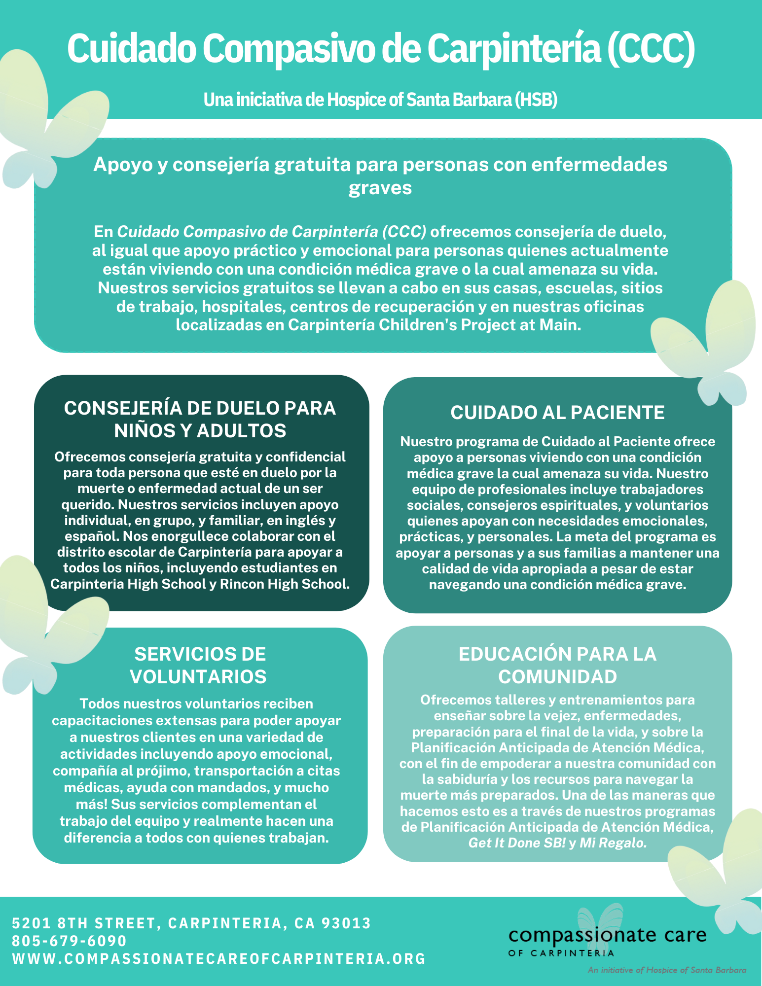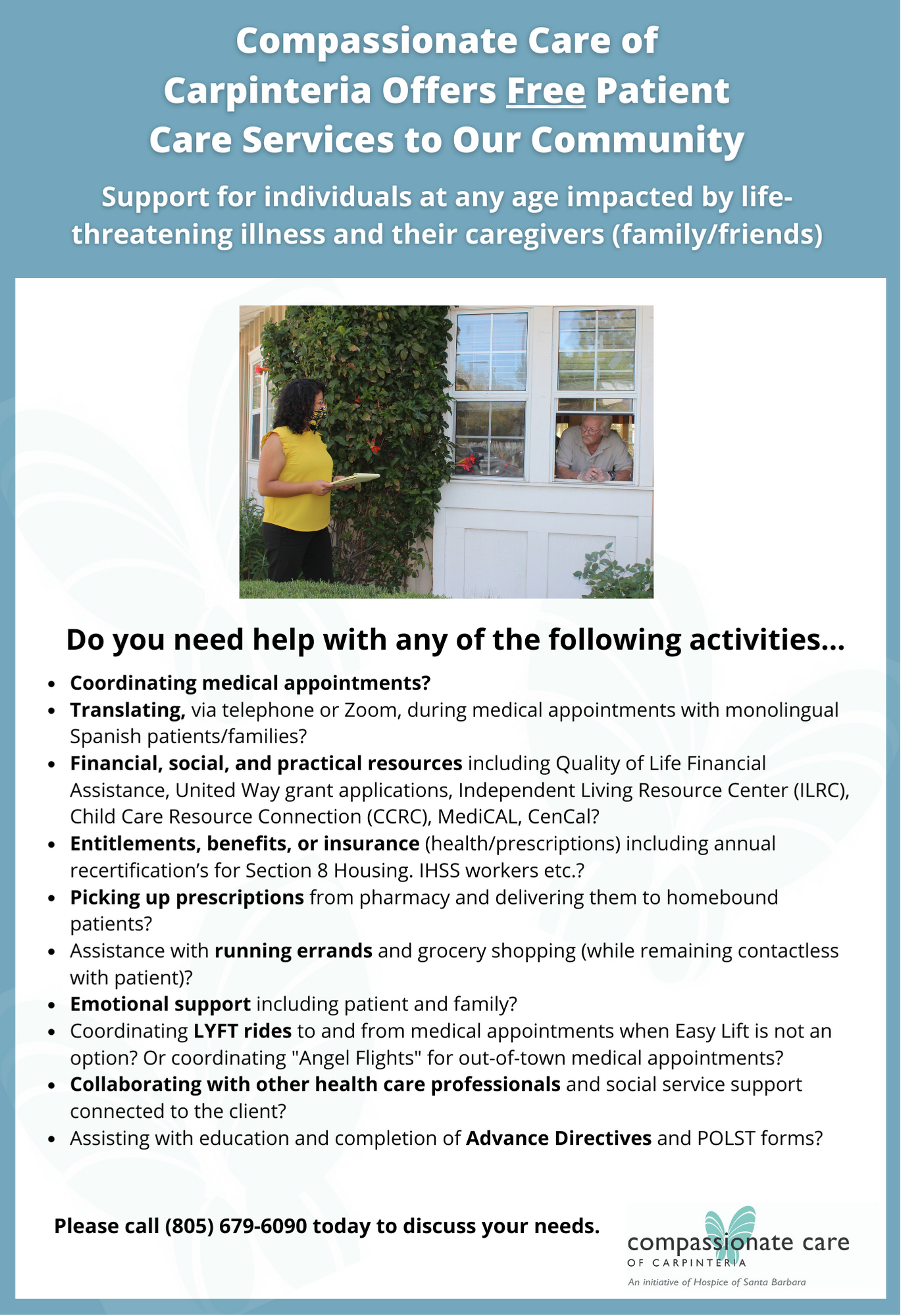 Compassionate Care of Carpinteria, an initiative of Hospice of Santa Barbara, offers programs and services, completely free of charge, to anyone grieving the loss of a loved one or struggling with a life-threatening illness. Services include counseling, practical care, and medical navigation.