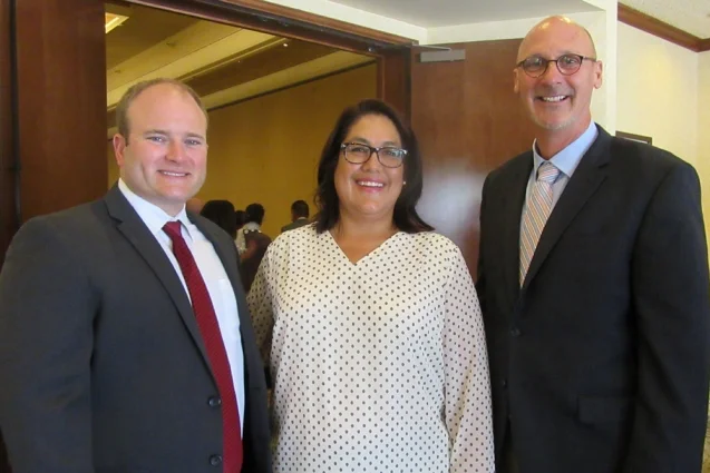 Hospice of Santa Barbara board president Eric Bowers, left, Clinical Services Director Gabriela Dodson and CEO David Selberg at the 2016 Heroes of Hospice awards luncheon Sept. 7 at The Fess Parker. (Rochelle Rose / Noozhawk photo)