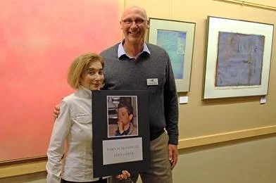 From left, Mary Schlesinger, sister of late artist of John Schlesinger, and David Selberg, HSB CEO. Mary is holding a photo of her brother. Courtesy photo.